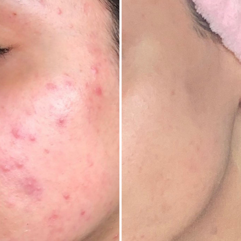 The Bentonite Eraser Clay was the next product she introduced into her routine, which helped to reduce her breakouts and clogged pores. Once those were cleared up, she swapped her mask treatment to the Illuminating Rose Clay which smoothed the texture left behind from her acne, and the Turmeric Serum to fade leftover scarring.