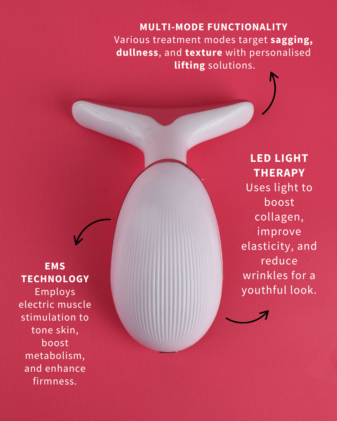 Experience personalized skincare with various treatment modes specifically targeting sagging, dullness, and uneven texture. This device provides tailored solutions for lifting, tightening, and contouring your skin, ensuring a customized approach to your beauty routine.
